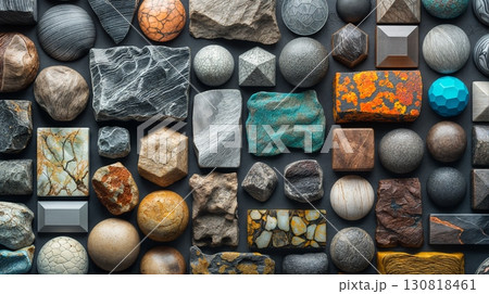 Stones organized diverse geometric rough textured shapes colors dark background overhead view