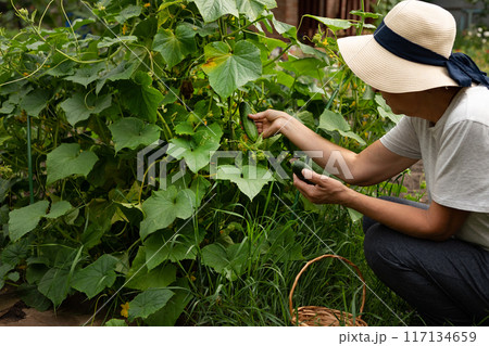 A farmer woman in a cotton apron tears cucumbers in a greenhouse into a wicker basket. The concept of harvesting. Summer and autumn on the farm are filled with organic themes. Close-up.