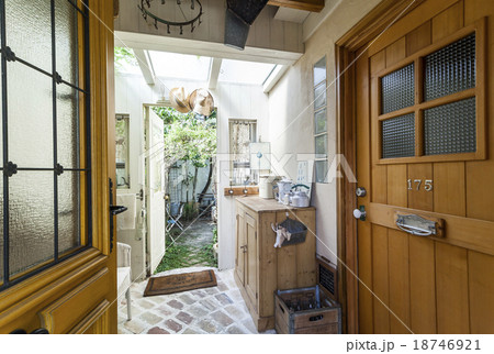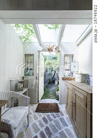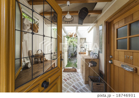 ドア越しに見るナチュラルカントリーの家の土間風景