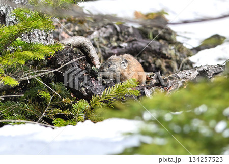 残雪の残る岩の上で植物を食べるエゾナキウサギ