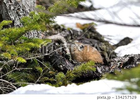 残雪の残る岩の上に座るエゾナキウサギ