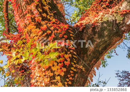 太い木の幹に絡まる真っ赤に紅葉したツタの葉 (東京都、墨田区、向島百花園)