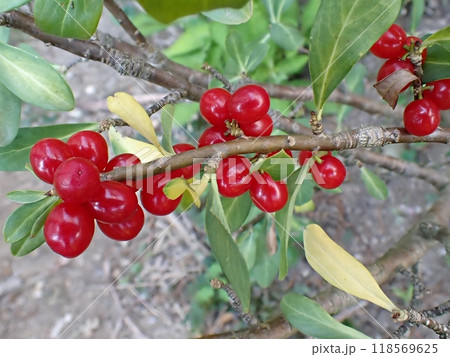 オニシバリの赤い毒性果実が実る枝葉(自然光&ストロボ・マクロレンズ接写)