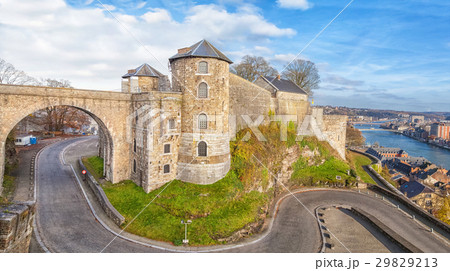 Citadel of Namur Citadelle de Namur stone fortress on hill, Sambre river embankment promenade with old colorful buildings and green trees in Namur historical city centre, Wallonia Region, Belgium