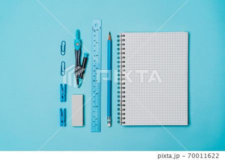 A set of colorful school and office stationery icons including pencils, a pen, erasers, rulers, brushes
