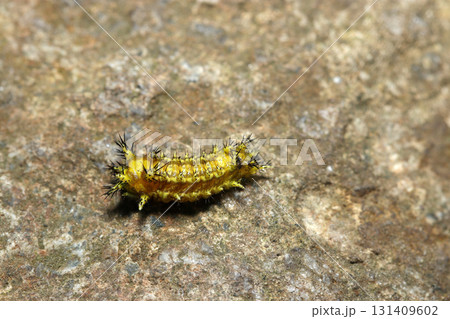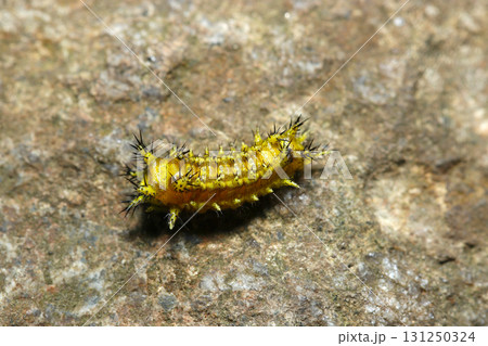 刺されると激痛の黒い棘と黄色い体色のヒメクロイラガ蛾幼虫(自然環境下昆虫類ストロボマクロ撮影)