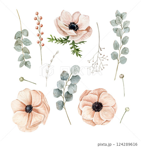 Watercolor hand drawn set with three anemones, branches of eucalyptus, dry flowers and berries