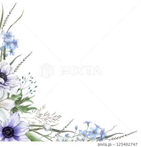 Floral arrangement of blue forget-me-nots, anemones, lilies of the valley, green leaves and wild grass. Watercolor botanical square frame for eco branding, cards, wedding design, botanical projects.