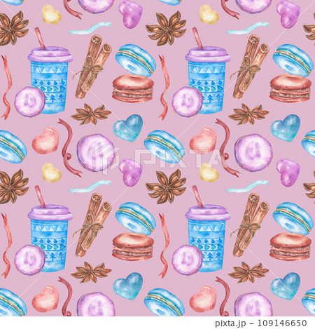 Watercolor pattern for your design, cinnamon, coffee, cozy cookies macaroons. Watercolor bakery clipart set of cookies. Traditional French pastry. Cute pattern for cafe, textile and menu design