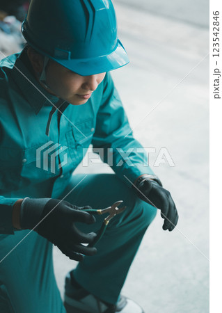 工具棚から工具を取る作業員男性手元 メンテナンスイメージ