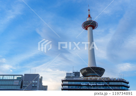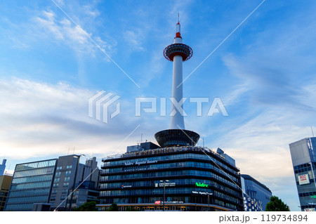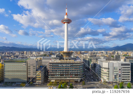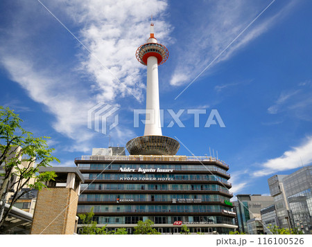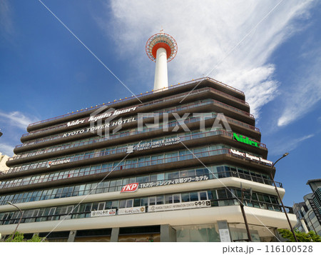 青空に映える京都タワーと京都駅前都市風景