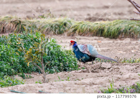 構造色が美しいキジ(キジ科)。日本国群馬県、利根川河川敷にて。 2024年3月23日撮影。