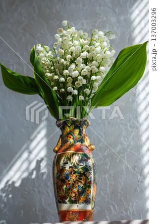 Fresh lily of the valley arrangement in oriental vase. Natural light through window. Spring bouquet with green leaves. Home decor