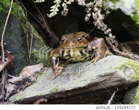 春の沢の岩間から顔を出すアズマヒキガエル
