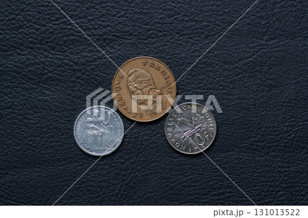 黒いレザーの上のニューカレドニア硬貨