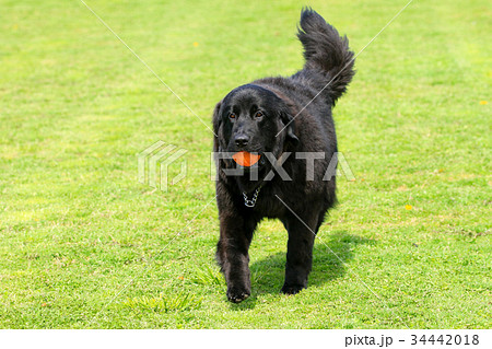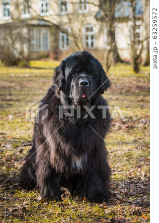 Black Newfoundland Dog Summer Meadow. Outdoor Full Length Portra