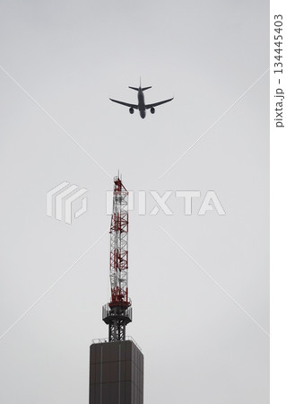 聳え立つ高層ビルとその脇を飛行する旅客機が見える