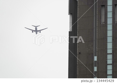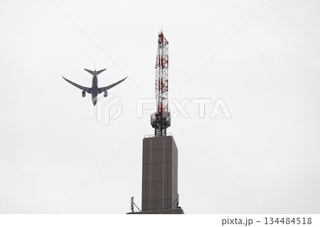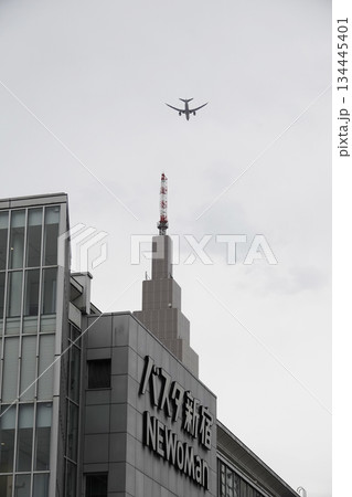 東京 新宿駅南口からの都市風景 ビルの上にジェット旅客機が見える