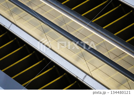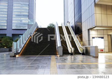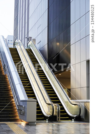 商業施設ビルの間に設置されている屋外のエスカレーター