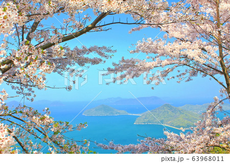 【香川県】 桜満開の紫雲出山と瀬戸内海の島々