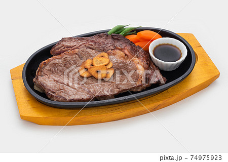 牛もも肉のステーキを鉄板で焼く