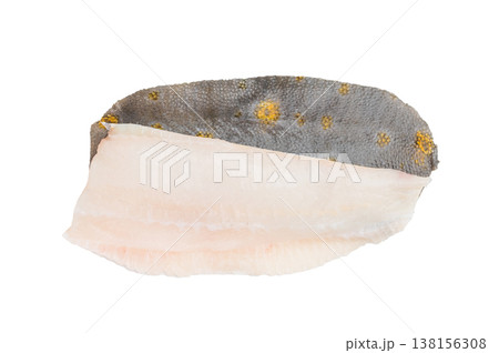 Cold smoked halibut fish with skin isolated on white background. Smoked halibut steak isolated