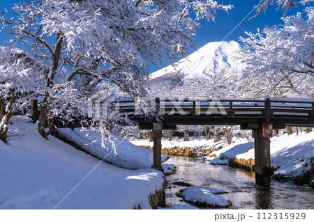 《山梨県》冬の富士山・雪景色の忍野村新名庄川
