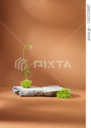 The natural cosmetics promotional photo with an empty stone platform for product presentation, decorated with green mosh and a flower branch, against on brown background. Designing and copy space