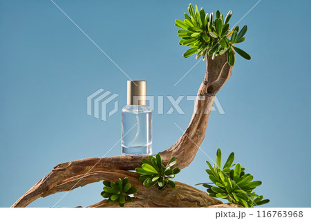 Frontal shot photography over blue background, a dry branch with green leaves displaying an unlabeled serum bottle. Front angle shot, copy space for text