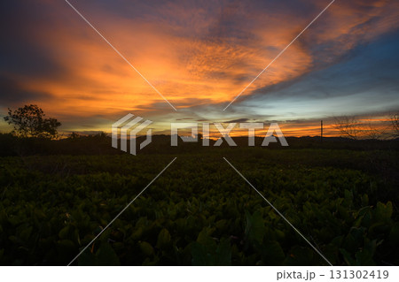 Beautiful sunset sky over land with glowing clouds.