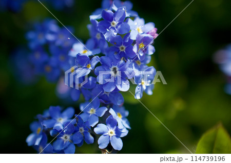 「誠の愛」の花言葉を持つ青いワスレナグサ。朝露に濡れて「私を忘れないで」の花言葉も寄り添う。