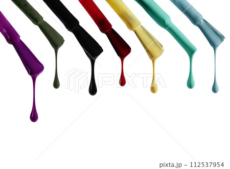 Variety of multicolored nail polish drops flowing from the brush isolated on white background. Set of gel nail polish swatches for design.