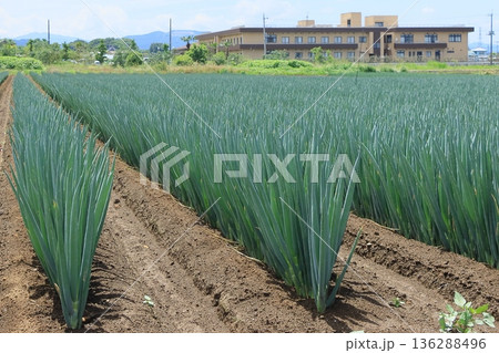 北海道 夏の青空と広大なネギ畑