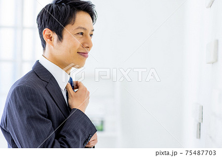 鏡を見ながら身支度をするサ鏡を見ながら身支度をするサラリーマンラリーマン