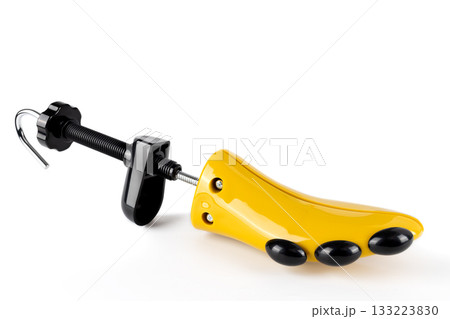 Plastic yellow shoe stretcher with black knobs for adjusting shoe width and shape on white background. Close-up.