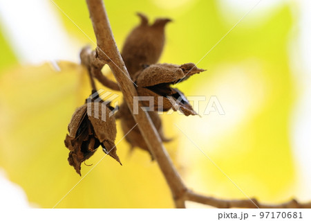 自然 植物 マンサク、九月中旬の果実。緑色がなくなって茶色くなりました、もうしばらくではじける?
