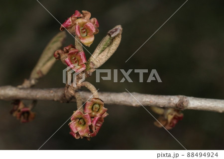 自然 植物 マンサク、四月。花の終わりと芽吹き、花びらの落ちた花の中に雌蕊の二本の花柱が見えます