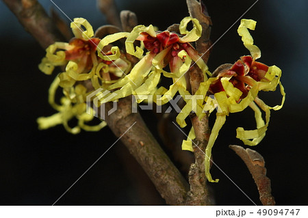 自然 植物 マンサク、三月初め。裸木に鮮やかな赤と黄色の花