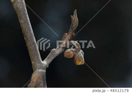 自然 植物 マンサク、冬芽。芽鱗が剥がれて裸芽状態の葉芽です