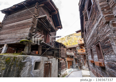 旧市街にあるヒンタードルフ通りの歴史的な木造シャレーとネズミ返しの小屋。ツェルマット、ヴァレー州、ス