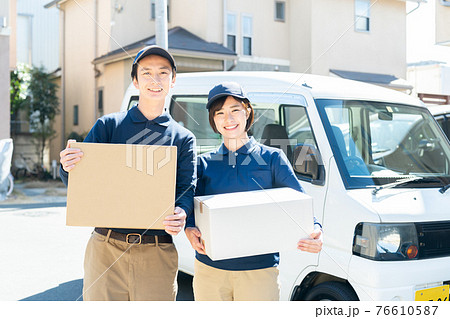 荷物の積み下ろしをする軽貨物ドライバーの女性。引越しや宅配サービスのイメージ。