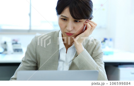 ノートパソコンで仕事をする女性 上半身 困り顔 シンプル グレー