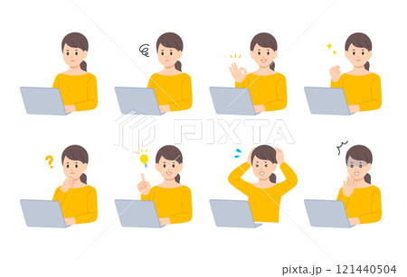 パソコンを見ながらいろいろな表情・ポーズをする若い女性のセット【人物ベクターイラスト素材】