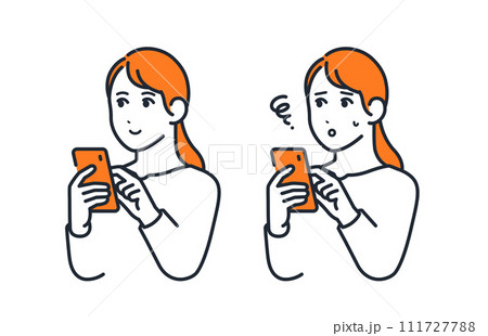 スマホ操作で困っている女性の上半身イラスト素材|トラブル・悩み
