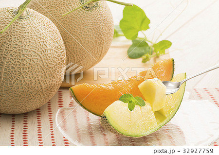 注意)メロン本体と背景のグリーン布にレタッチ痕が残ります。マスクメロン、高級メロン。