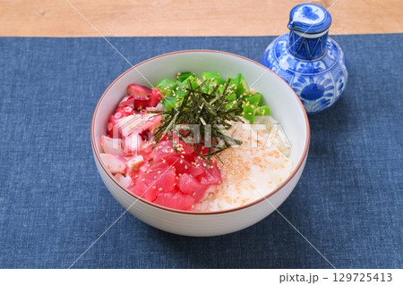 夏のネバネバとろとろ海鮮丼、夏料理、オクラ、とろろ芋、マグロ、タコ。