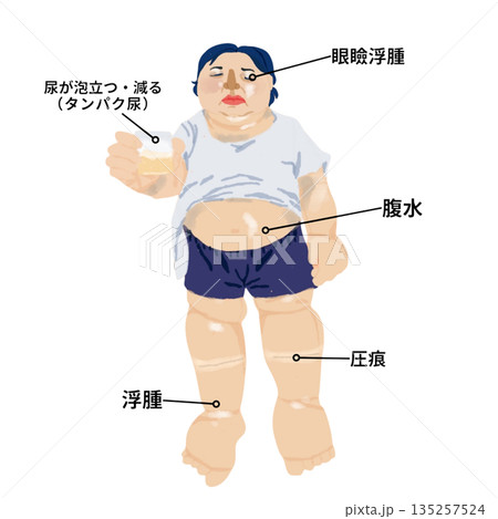 ネフローゼ症候群の症状イラスト|全身浮腫・眼瞼浮腫・腹水・タンパク尿を示す患者