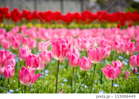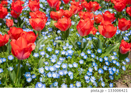 赤いチューリップとネモフィラ《三重県 なばなの里》