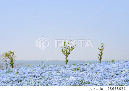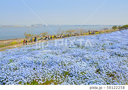 ネモフィラが咲き誇る春の海辺の風景(大阪・舞洲)