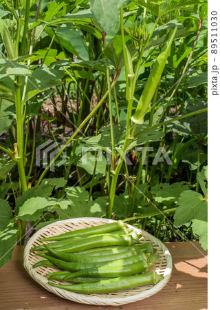 オクラの株と収穫したオクラ